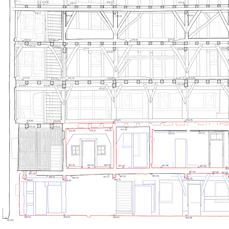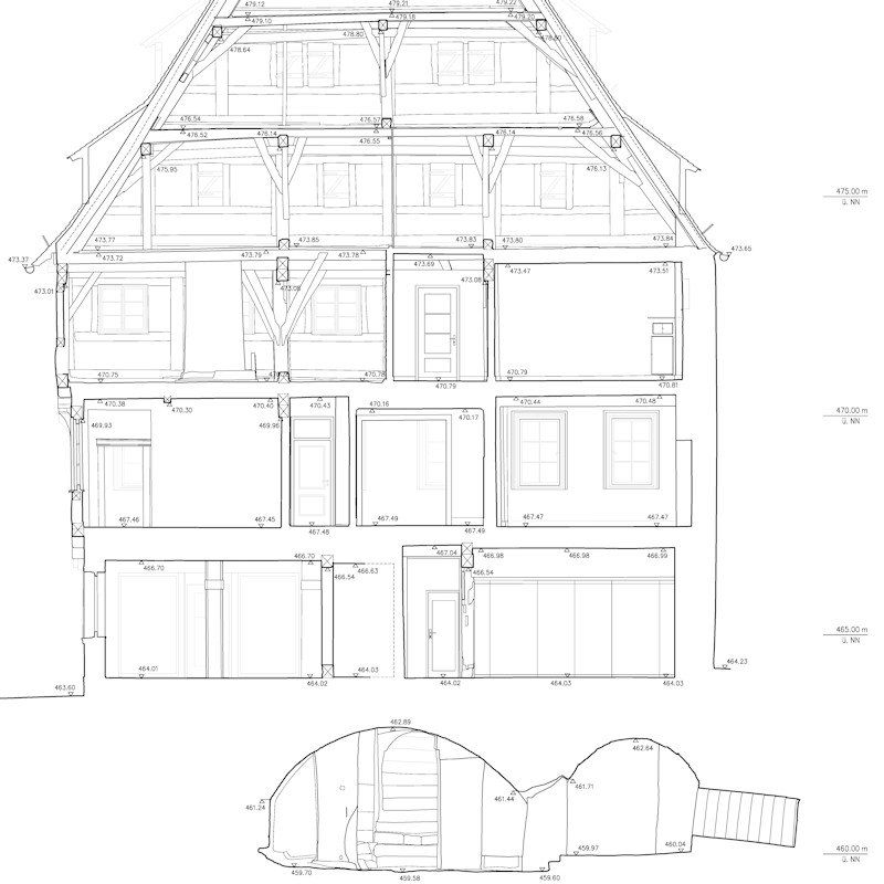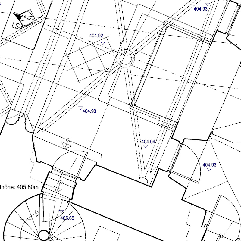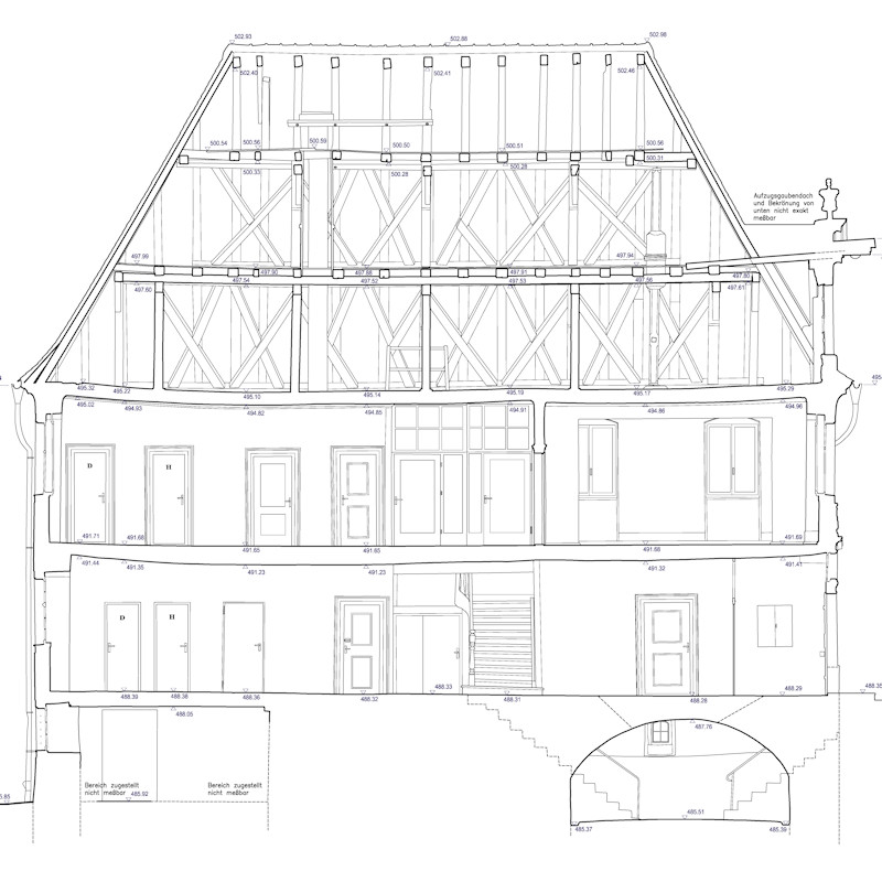 Bauaufnahmen geben detaillierte Erfassungen und Darstellung von Bauwerken wieder. Häufig werden unter Denkmalschutz stehende Gebäude detail- und verformungsgetreu aufgenommen und Pläne, den Anforderungen entprechend, erstellt. Die Umsetzung der Bauaufnahme erfolgt mit Messgeräten nach neusten technischen Standards. Alle Pläne erstelle ich im CAD, so dass die übergabe der Daten sowohl digital als auch analog erfolgt.